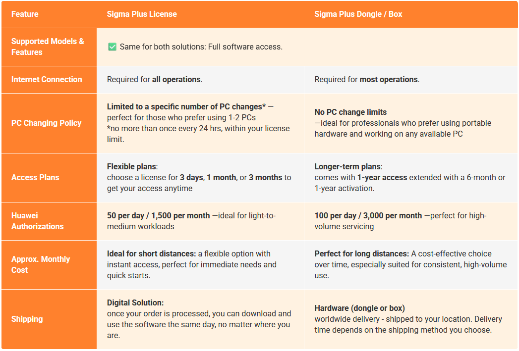 Sigma Plus is a powerful software solution designed to service a wide range of devices including Huawei, Honor, Moto, ZTE, Vivo, Samsung, Alcatel, and many others.